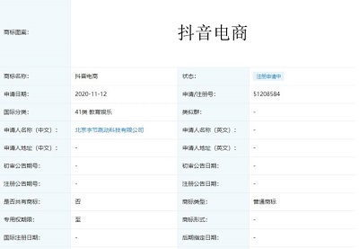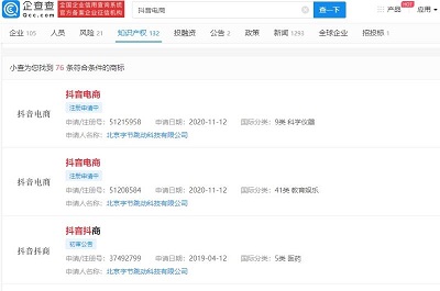 企查查 APP 顯示,北京字節(jié)跳動科技有限公司于 11 月 12 日申請注冊 “抖音電商”、“抖音抖商”系列商標,涉國際分類教育娛樂、科學儀器、金融物管、廣告銷售、醫(yī)藥、方便食品等,目前商標狀態(tài)為 “注冊申請中”。