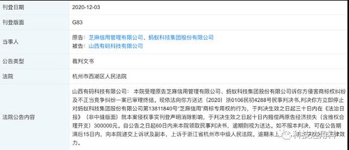 芝麻信用管理有限公司、螞蟻科技集團(tuán)股份有限公司與被告山西有碼科技有限公司侵害商標(biāo)權(quán)糾紛及不正當(dāng)競爭糾紛日前一審宣判,杭州市西湖區(qū)人民法院判處山西有碼公司立即停止侵害螞蟻集團(tuán)第13811840號“芝麻信用”商標(biāo)專用權(quán),在《法治日報》刊登聲明消除影響,同時賠償兩原告經(jīng)濟(jì)損失(含維權(quán)合理開支)30萬元,案號為(2020)浙0106民初4288號。