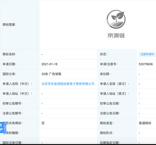 1月18日,北京京東叁佰陸拾度電子商務(wù)有限公司申請(qǐng)“京源鏈”圖案類商標(biāo),商標(biāo)注冊(cè)分類涉35類廣告銷售類。商標(biāo)狀態(tài)為注冊(cè)申請(qǐng)中。