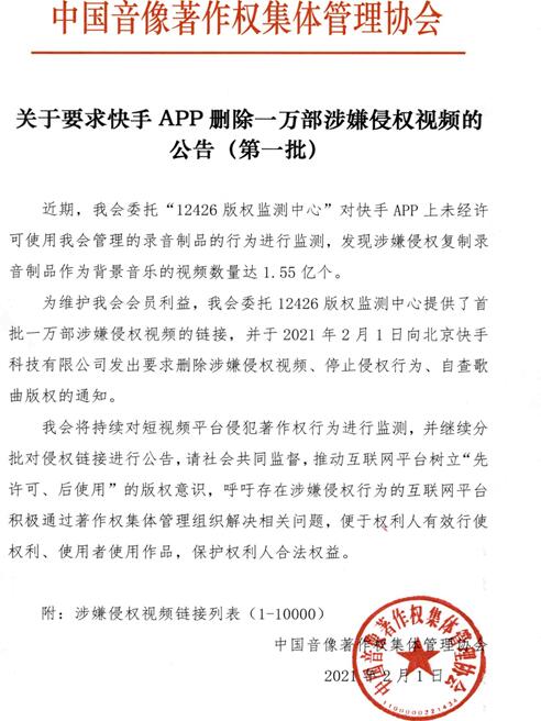 2月1日,中國音像著作權(quán)集體管理協(xié)會(下稱“音集協(xié)”)在官網(wǎng)披露了一則題為《關(guān)于要求快手APP刪除一萬部涉嫌侵權(quán)視頻的公告》,指出其近日委托“12426版權(quán)監(jiān)測中心”對快手上未經(jīng)許可使用音集協(xié)管理的錄音制品的行為進行監(jiān)測,發(fā)現(xiàn)涉嫌侵權(quán)復(fù)制錄音制品作為背景音樂的視頻數(shù)量達1.55億個。