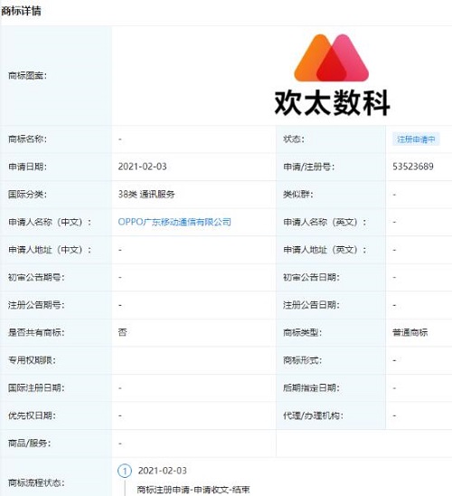 近日OPPO廣東移動通信有限公司申請注冊“歡太數(shù)科”商標(biāo),國際商標(biāo)注冊分類為35類 廣告銷售、38類 通訊服務(wù),商標(biāo)狀態(tài)為“注冊申請中”。