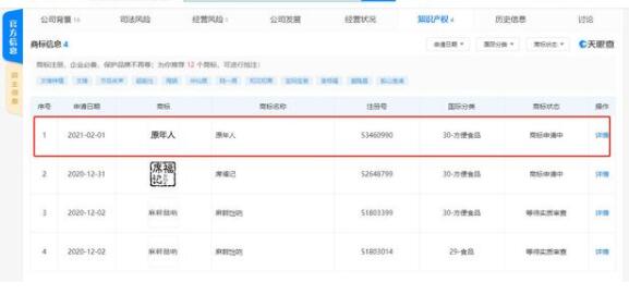 2021年春節(jié),部分人們響應(yīng)政府號召,減少流動,選擇就地過年,故產(chǎn)生了新的網(wǎng)絡(luò)流行語——“原年人”。天眼查App顯示,近日,兩家公司申請注冊“原年人”商標(biāo),國際商標(biāo)注冊分類涉及廣告銷售、服裝鞋帽、方便食品,商標(biāo)狀態(tài)均為商標(biāo)申請中。