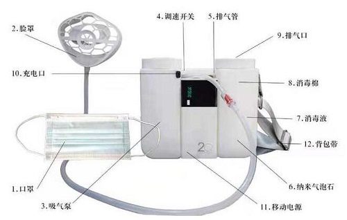 據(jù)悉,該實用新型口罩,一次性口罩為濾體,敷于透氣臉罩上,其臉罩內(nèi)安裝一吸管,吸管的另一端連接微型吸氣泵進(jìn)口,吸氣泵出口管的另一端接入納米氣泡石,氣泡石放入消毒液容器底部,容器下半部是消毒液,上半部是消毒棉,所有部件裝入背包,方便病人站立或出行時使用,病人呼出的氣體及病毒注入消毒液及消毒棉后,在浮出過程中病毒被殺死。