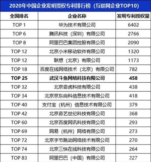 其中,游戲直播平臺斗魚,發(fā)明授權(quán)專利申請量位居中國互聯(lián)網(wǎng)行業(yè)第七,是直播行業(yè)唯一上榜平臺。
