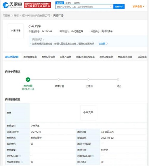 據(jù)天眼查顯示,“小米汽車”商標(biāo)已被申請(qǐng)注冊(cè),國(guó)際分類為廣告銷售、運(yùn)輸工具,申請(qǐng)人為紹興冀祥紡織品有限公司,申請(qǐng)日期為2021年3月,目前商標(biāo)狀態(tài)為“商標(biāo)申請(qǐng)中”。