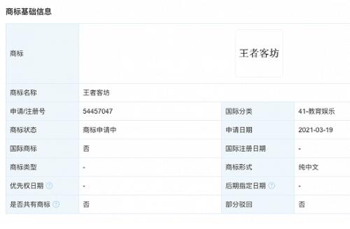 近日,騰訊科技(深圳)有限公司申請注冊“王者客坊”、“王者客棧”、“英雄客坊”等商標,國際商標分類涉設(shè)計研究、教育娛樂等,商標狀態(tài)為“注冊申請中”。