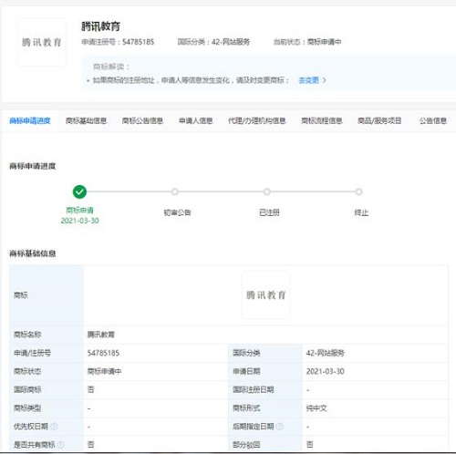 近日,騰訊科技(深圳)有限公司申請(qǐng)注冊(cè)“騰訊教育”商標(biāo),國(guó)際分類包含教育娛樂、網(wǎng)站服務(wù)、科學(xué)儀器等,目前商標(biāo)狀態(tài)均為商標(biāo)申請(qǐng)中。