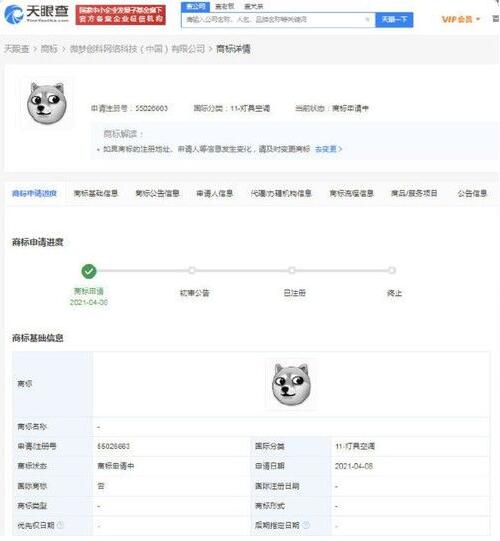 近日,微夢創(chuàng)科網(wǎng)絡科技(中國)有限公司申請“狗頭”圖形商標,注冊號為55026663,國際分類為燈具空調(diào),商標狀態(tài)為“商標申請中”。