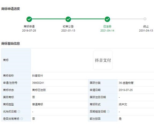 近日,北京字跳網(wǎng)絡(luò)技術(shù)有限公司申請的金融物管類“抖音支付”“抖分期”“抖享付”商標(biāo)陸續(xù)完成注冊。
