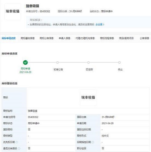 近日,瑞幸咖啡(中國)有限公司申請注冊“瑞幸吸貓”“瑞幸貓咪”商標,國際分類為飼料種籽、方便食品、餐飲住宿等,目前商標狀態(tài)均為商標申請中。