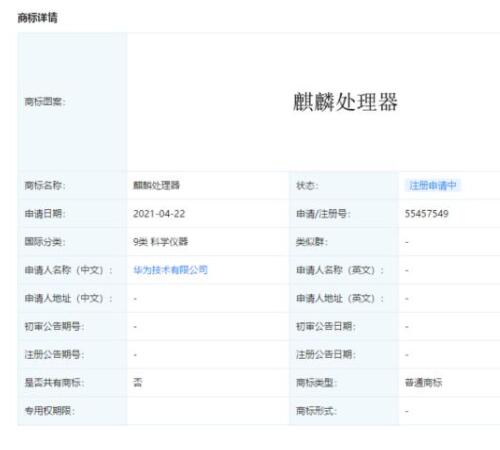 華為技術(shù)有限公司還曾于去年 9 月 23 日申請(qǐng)注冊(cè) " 麒麟芯片 " 商標(biāo),國(guó)際分類同樣為 "9 類科學(xué)儀器 ",狀態(tài)為 " 注冊(cè)申請(qǐng)中 "。