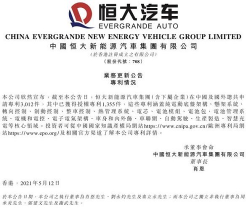 在上海車展九車齊發(fā)后,5月12日,恒大汽車上市公司發(fā)布公告稱,目前恒大新能源汽車集團(tuán)(含下屬企業(yè))已經(jīng)在中外共計(jì)申請(qǐng)專利3012件,并已經(jīng)獲得授權(quán)專利1355件。這些專利涵蓋多個(gè)關(guān)鍵部件、電池電控以及智能網(wǎng)聯(lián)等核心領(lǐng)域。