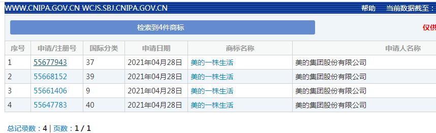 美的集團(tuán)股份有限公司(以下簡(jiǎn)稱“美的集團(tuán)”)新增“美的一株生活”商標(biāo)信息,國(guó)際分類涉及建筑修理、材料加工、運(yùn)輸貯藏,申請(qǐng)日期為2021年4月28日,商標(biāo)狀態(tài)為商標(biāo)申請(qǐng)中。