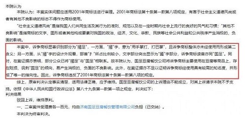 判決書中表示濟(jì)南國足豆腐餐飲公司將訴爭(zhēng)商標(biāo)主要使用在豆腐等商品上,存在貶損、諷刺"國足"的傾向,易產(chǎn)生消極的、負(fù)面的不良影響。此外,在案證據(jù)亦不足以證明訴爭(zhēng)商標(biāo)經(jīng)使用具有較高的知名度,并形成了唯一的指向性,違反商標(biāo)法相關(guān)規(guī)定。