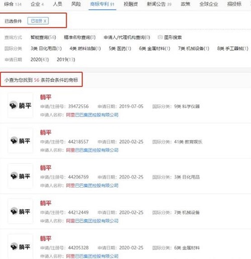 阿里巴巴目前共申請注冊躺平商標(biāo)91次,其中56個商標(biāo)已注冊,包含躺平、躺平設(shè)計家、躺大平。其中早在2018年12月阿里巴巴就曾注冊躺平商標(biāo)并開發(fā)相關(guān)應(yīng)用。