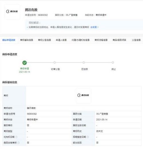 近日,騰訊科技(深圳)有限公司申請注冊“騰訊有數(shù)”商標,國際商標分類為網(wǎng)站服務、廣告銷售等,目前商標狀態(tài)多為“商標申請中”。