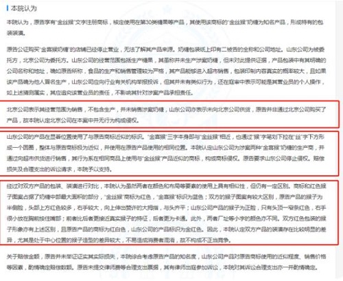 本案裁判結(jié)果為,本判決生效后,被告山東匯福園食品有限公司停止在其奶糖產(chǎn)品的包裝上使用與原告的“金絲猴”商標(biāo)近似的“金喜猴”標(biāo)識并賠償原告經(jīng)濟損失及合理支出3萬元等。