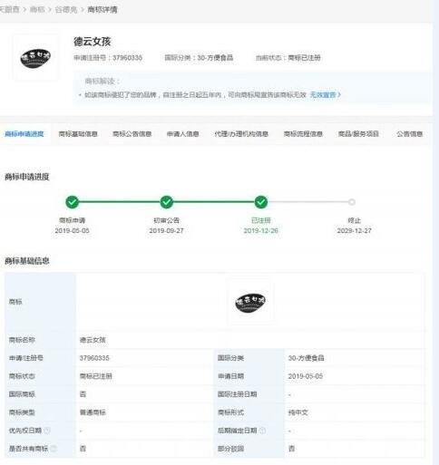 “德云女孩”商標(biāo)已被多家公司及自然人申請注冊,申請人包括杭州臉枕科技有限公司、谷德亮等,國際分類涉及樂器、方便食品、飼料種籽等,商標(biāo)狀態(tài)多為“商標(biāo)已注冊”“等待實質(zhì)審查”。