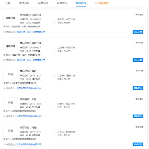 “雞娃”商標(biāo)已被多家公司申請(qǐng)注冊(cè),國(guó)際分類(lèi)涉及社會(huì)服務(wù)、教育娛樂(lè)、辦公用品等。申請(qǐng)人包括北京字節(jié)跳動(dòng)科技有限公司、成都大贊宏圖科技有限公司、珠海我愛(ài)生活科技有限公司等。目前商標(biāo)狀態(tài)為等待實(shí)質(zhì)審查、無(wú)效等。