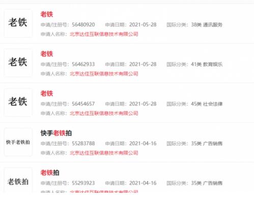 快手關(guān)聯(lián)公司北京達(dá)佳互聯(lián)信息技術(shù)有限公司曾于2017年申請(qǐng)注冊(cè)老鐵商標(biāo),目前已有38項(xiàng)申請(qǐng)通過,商標(biāo)狀態(tài)為已注冊(cè)。
