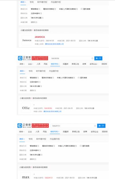 6月3日,騰訊科技(深圳)有限公司申請注冊“Ollie”、“JAMOCA”、“Max”商標(biāo),國際分類涉9類科學(xué)儀器。