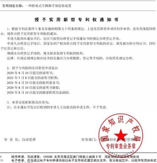 甘肅建投一建公司獲悉, 該公司申報(bào)的 " 一種附著式升降腳手架防墜裝置 " 實(shí)用新型專利經(jīng)國(guó)家知識(shí)產(chǎn)權(quán)局審核通過,獲得授權(quán)。