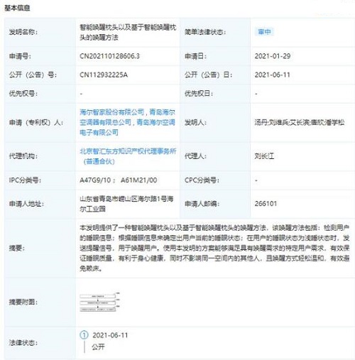 海爾日前公布了一項名為“智能喚醒枕頭以及基于智能喚醒枕頭的喚醒方法”的發(fā)明專利,專利公開號為CN112932225A。