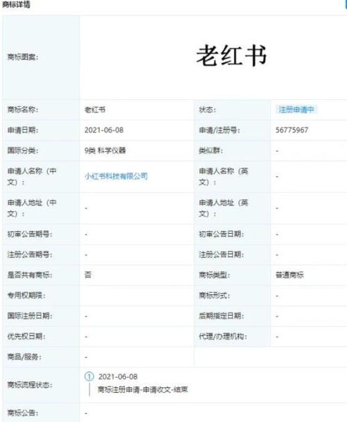 小紅書科技有限公司申請注冊“老紅書”商標,國際分類包括通訊服務、科學儀器,商標狀態(tài)顯示申請中。