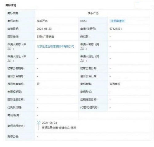 近日,快手關(guān)聯(lián)公司北京達(dá)佳互聯(lián)信息技術(shù)有限公司新增“快手嚴(yán)選”商標(biāo)申請信息,國際分類涉及廣告銷售,目前商標(biāo)狀態(tài)為“注冊申請中”。