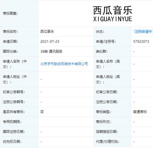 近日,字節(jié)跳動(dòng)公司新增“西瓜音樂(lè)”商標(biāo)申請(qǐng)信息,國(guó)際分類為通訊服務(wù),目前商標(biāo)狀態(tài)為“注冊(cè)申請(qǐng)中”。