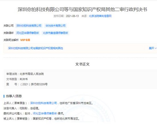 近日,深圳你拍科技有限公司等與國家知識產(chǎn)權(quán)局其他二審行政判決書公開,原審第三人為華為技術(shù)有限公司。