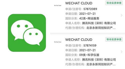 騰訊正在申請(qǐng) WECHAT CLOUD (微信云)商標(biāo)。商標(biāo)分類(lèi)涉及網(wǎng)站服務(wù)、科學(xué)儀器、通訊服務(wù)以及廣告銷(xiāo)售四類(lèi)。