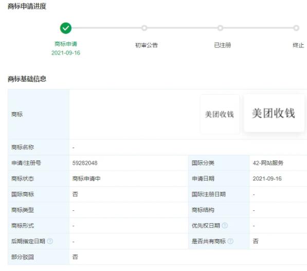 近日,美團(tuán)關(guān)聯(lián)公司北京三快科技有限公司新增 " 美團(tuán)收錢 " 商標(biāo)申請信息,國際分類涉及設(shè)計研究、廣告銷售,目前商標(biāo)狀態(tài)均為 " 注冊申請中 "。