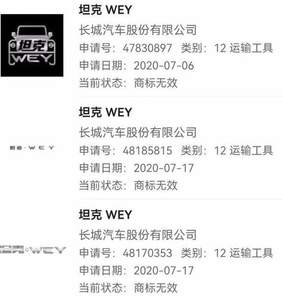據(jù)報(bào)道,通過相關(guān)網(wǎng)站查詢到:長城汽車申請(qǐng)的坦克 WEY、坦克 400、坦克 500 和坦克 600 等商標(biāo),均處于商標(biāo)無效狀態(tài)。