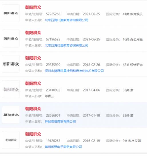 朝陽(yáng)群眾已被多方申請(qǐng)注冊(cè)成商標(biāo),國(guó)際分類包括設(shè)計(jì)研究、餐飲住宿等,目前商標(biāo)狀態(tài)多為無(wú)效。今年6月,北京一家公司申請(qǐng)注冊(cè)辦公用品、教育娛樂類朝陽(yáng)區(qū)群眾商標(biāo),目前該商標(biāo)狀態(tài)為注冊(cè)申請(qǐng)中。