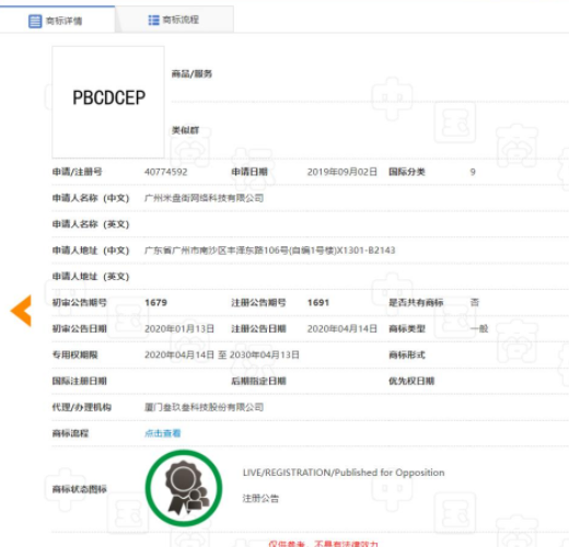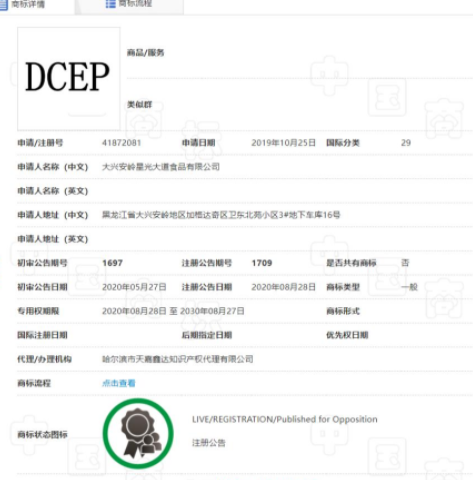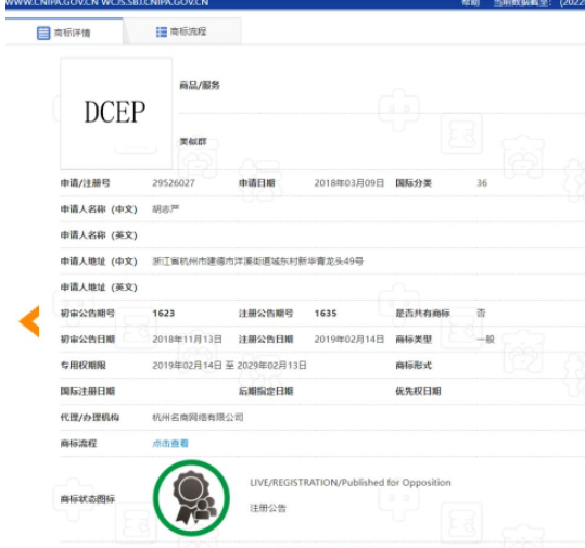 2018年3月9日以來,自然人胡志嚴(yán)在第36類,呼倫貝爾首善投資管理有限公司在第3類、第9類、第25類、第35類、第36類、第41類、第42類和第43類,廣州米盤街網(wǎng)絡(luò)科技有限公司在第3類、第9類、第18類、第20類、第25類、第33類、第35類、第36類、第38類、第42類和第43類,大興安嶺星光大道食品有限公司在第29類和第32類,福州旗盛醫(yī)藥科技有限公司在第11類、第12類、第18類、第30類和第33類,時技科投資發(fā)展(深圳)有限公司在第14類,江西頌顏商貿(mào)有限公司在第35類和第38類,廣州趣家科技有限公司在第9類和第42類共獲準(zhǔn)注冊“DCEP”“ECNY”“PBCDCEP”等29件與數(shù)字人民幣相關(guān)的商標(biāo)。