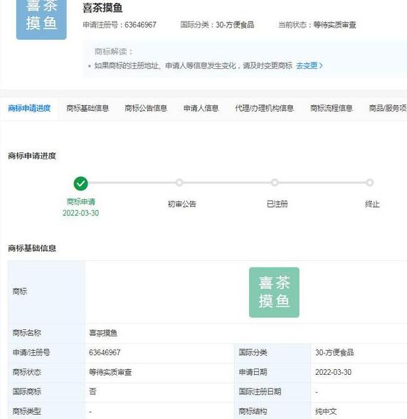 近日,喜茶關(guān)聯(lián)公司深圳美西西餐飲管理有限公司申請注冊“喜茶摸魚”商標(biāo),國際分類為方便食品,目前商標(biāo)狀態(tài)為等待實(shí)質(zhì)審查。