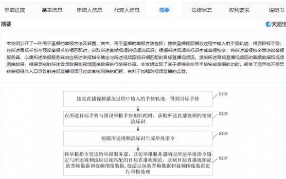 專利摘要顯示,舉報(bào)方法包括:接收直播視頻播放過程中輸入的手勢(shì)軌跡,得到目標(biāo)手勢(shì);在目標(biāo)手勢(shì)與預(yù)設(shè)舉報(bào)手勢(shì)相匹配時(shí),獲取直播視頻的視頻流標(biāo)識(shí),并生成舉報(bào)指令;將指令發(fā)送給服務(wù)器,服務(wù)器響應(yīng)后,確定目標(biāo)直播視頻流并錄制音視頻數(shù)據(jù),進(jìn)行舉報(bào)處理。本發(fā)明可實(shí)現(xiàn)基于交互手勢(shì)完成舉報(bào)的功能,避免因?qū)ふ也幻黠@的舉報(bào)操作入口導(dǎo)致的違規(guī)直播視頻已過或者被刪除的問題,有利于加強(qiáng)對(duì)視頻直播的監(jiān)管。