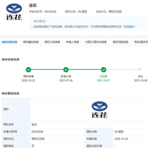 據天眼查App顯示,石家莊以嶺藥業(yè)股份有限公司已注冊100多個“以嶺”商標,涵蓋45個國際分類,最早的商標于2000年獲批。該公司申請的“連花”商標也有20多個已獲批注冊,國際分類涉及醫(yī)藥、醫(yī)療器械、日化用品等,最早的商標于2005年獲批。