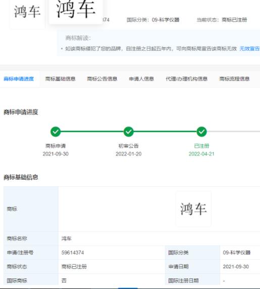 4月21日消息,華為技術(shù)有限公司申請注冊的“鴻車”商標(biāo)注冊成功,國際分類涉及科學(xué)儀器、網(wǎng)站服務(wù),申請日期為2021年9月。