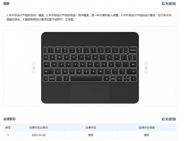 專利摘要顯示,本外觀設(shè)計產(chǎn)品用作鍵盤,是一種計算機輸入裝置,設(shè)計要點在于形狀與圖案的結(jié)合。