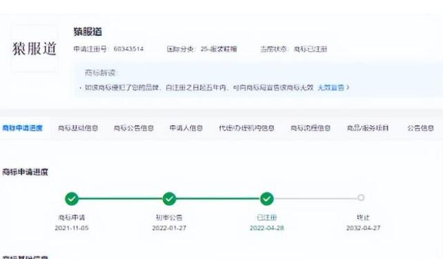 近日,猿輔導(dǎo)旗下北京冰原服飾有限公司(下稱“冰原服飾”)申請(qǐng)的多個(gè)“猿服道”商標(biāo)注冊(cè)成功,國(guó)際分類為服裝鞋帽、皮革皮具、材料加工,申請(qǐng)日期為2021年11月。