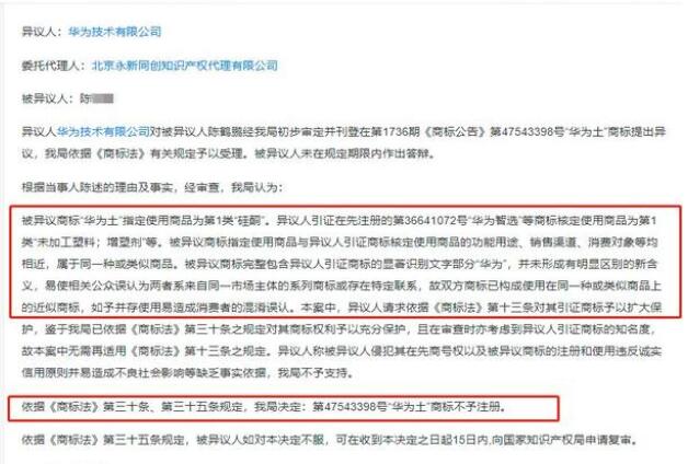 文書詳情顯示,華為技術(shù)有限公司對陳某申請的“華為土”商標(biāo)提出異議。商標(biāo)局審查認(rèn)為,被異議商標(biāo)指定使用商品為第1類“硅酮”,與異議人引證在先注冊的“華為智選”等商標(biāo)核定使用的“未加工塑料;增塑劑”等屬于同一種或類似商品,被異議商標(biāo)完整包含異議人引證商標(biāo)的顯著識別文字部分“華為”,并未形成有明顯區(qū)別的新含義,如予并存使用易使消費者誤認(rèn)。因此,依據(jù)商標(biāo)法規(guī)定,第47543398號“華為土”商標(biāo)不予注冊。
