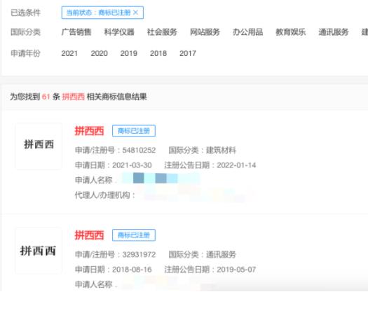 天眼查App顯示,目前注冊(cè)成功的“拼西西”商標(biāo)已經(jīng)有61個(gè),范圍涉及服裝鞋帽、辦公用品、教育娛樂等多個(gè)種類。