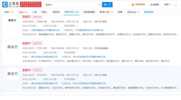 企查查APP顯示,多個自然人及公司申請的“都美竹”商標被駁回,商標狀態(tài)顯示為商標無效。商標分類包括服裝鞋帽、方便食品、日化用品等。