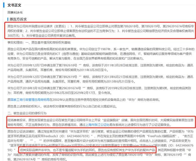 企查查APP顯示,近日,浙江省杭州市余杭區(qū)人民法院公布一起侵權(quán)華為商標(biāo)及不正當(dāng)競(jìng)爭(zhēng)糾紛的案件。華為技術(shù)有限公司經(jīng)消費(fèi)者投訴,發(fā)現(xiàn)被告深圳市金運(yùn)視訊設(shè)備有限公司在其網(wǎng)店中銷售未經(jīng)授權(quán)的多款華為耳機(jī),面向全國范圍長(zhǎng)時(shí)間、大規(guī)模實(shí)施侵害原告注冊(cè)的“華為”“HUAWEI”“FREEBUDS”商標(biāo)專用權(quán)。