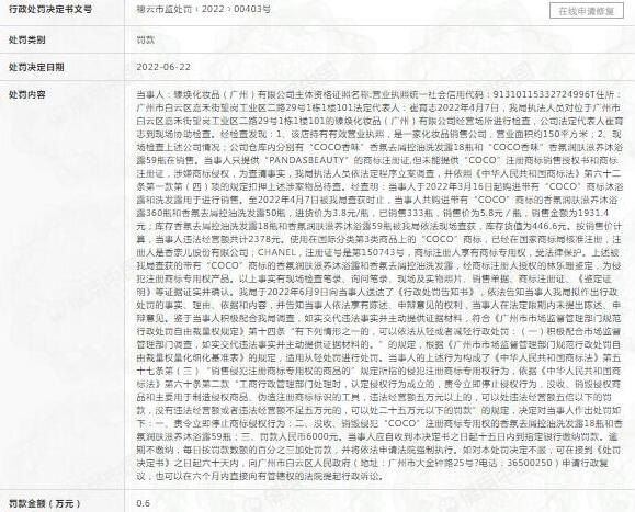 行政處罰決定書顯示,經(jīng)檢查發(fā)現(xiàn),該公司倉庫內(nèi)有“COCO香味”香氛去屑控油洗發(fā)露18瓶和“COCO香味”香氛潤膚滋養(yǎng)沐浴露59瓶在售,當(dāng)事人未能提供“COCO”注冊(cè)商標(biāo)銷售授權(quán)書和商標(biāo)注冊(cè)證,涉嫌商標(biāo)侵權(quán)。
