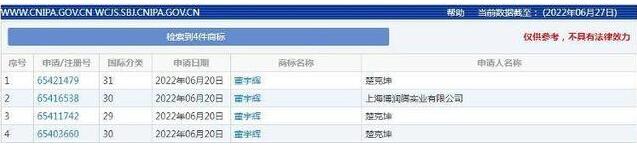 據(jù)國家知識產(chǎn)權(quán)局商標局官網(wǎng),“董宇輝”商標近日被上海博潤騰實業(yè)有限公司、自然人楚克坤申請注冊,國際分類包括咖啡、茶、米面、巧克力、糕點甜食等,查詢商標詳情顯示:此商標正等待受理,暫無法查詢詳細信息。
