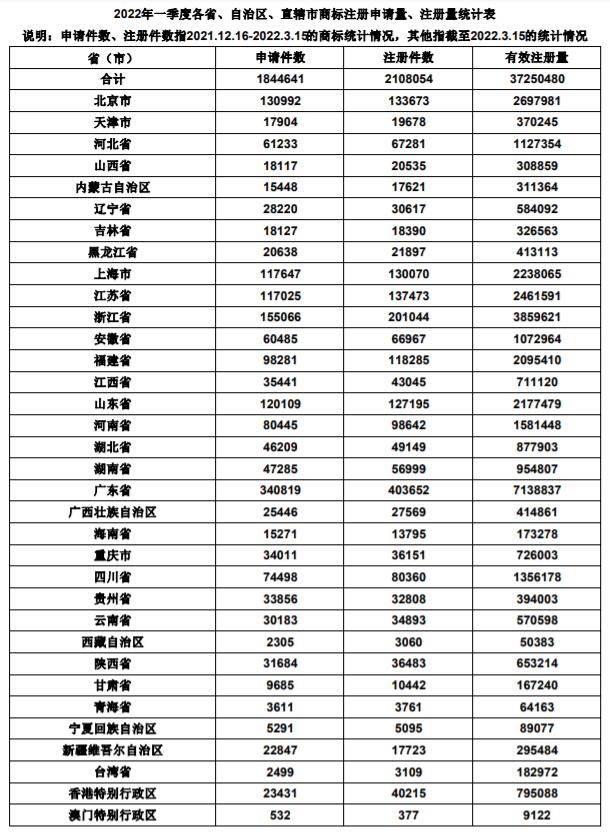 近日,國家知識產(chǎn)權(quán)局商標局發(fā)布《2022年一季度全國省市縣商標主要統(tǒng)計數(shù)據(jù)》,數(shù)據(jù)統(tǒng)計了2021年12月16日至2022年3月15日的商標注冊情況。