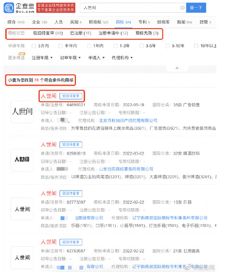 自該劇上映以來,獲得了眾多觀眾的好評(píng)。企查查APP顯示,目前多家公司及自然人共申請(qǐng)注冊(cè)了78枚“人世間”商標(biāo),國(guó)際分類包括樂器、日用器具、材料加工等,其中48枚商標(biāo)狀態(tài)為“駁回待復(fù)審”,15枚商標(biāo)成功注冊(cè),仍有12枚商標(biāo)狀態(tài)為“注冊(cè)申請(qǐng)中”。